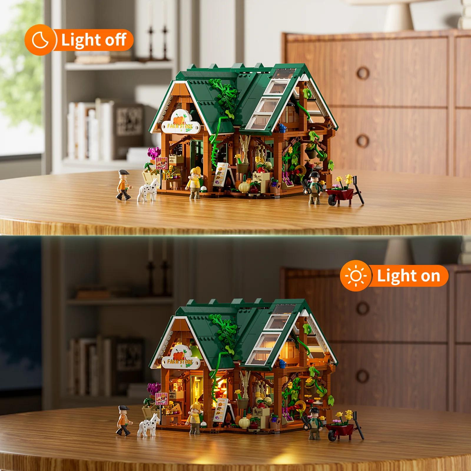 Dieser Hofladen verfügt über vier Beleuchtungsorte: zwei Scheunenlichter unter der Veranda, ein fluoreszierendes Licht auf dem Innendach und ein kühles Farblicht im Kühlschrank. Das gesamte Lichtdesign erinnert an ein ruhiges Bauernleben! (Batterie nicht im Lieferumfang enthalten)